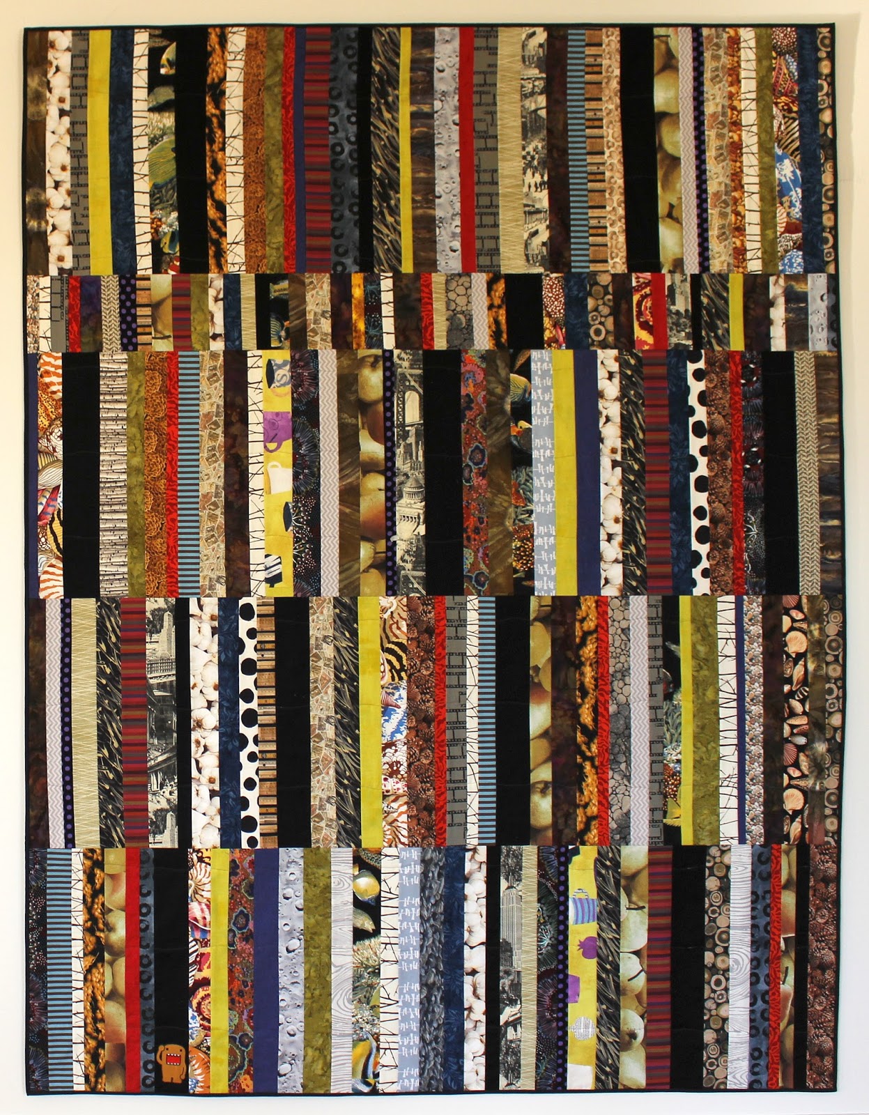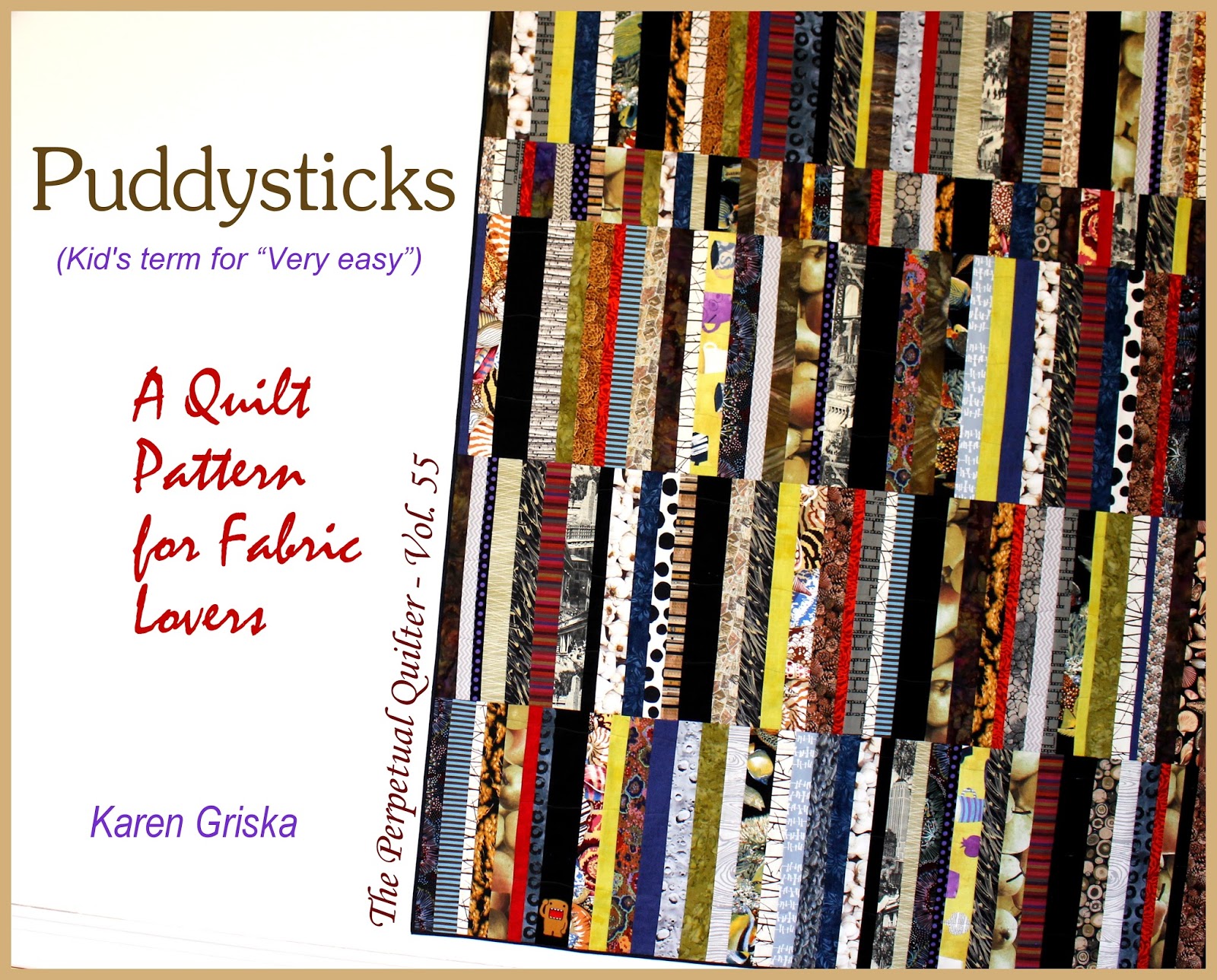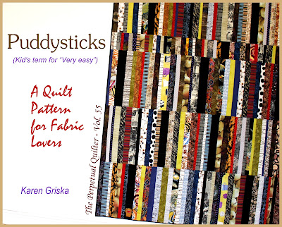Here's my latest quilt pattern: Puddysticks. It measures 65" x 84," XL twin (dorm bed). Instant download pdf, photos, helpful hints, 5 pages. You might already have all the fabrics you need for this string quilt, a fun stash-buster.